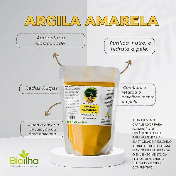Ilumina e revigora a pele: A argila amarela possui propriedades que ajudam a melhorar a circulação sanguínea na pele, proporcionando um efeito revitalizante e iluminador, deixando a pele com um aspecto saudável e radiante.