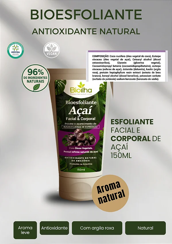 Pele Luminosa e Macia: As partículas do açaí promovem uma renovação celular suave, desobstruindo os poros e revelando uma pele com toque sedoso e um brilho natural.