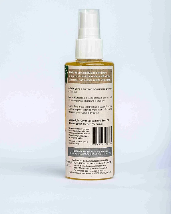 lixir natural que combina a nutrição do óleo de arroz com o aroma delicioso da manga, proporcionando hidratação profunda, clareamento de manchas e redução da aparência de estrias. Benefícios:Hidratação Intensa: O óleo de arroz, rico em vitamina E e ácidos graxos essenciais, penetra profundamente na pele, retendo a umidade e combatendo o ressecamento, deixando-a macia, suave e com um toque aveludado.Clareamento de Manchas: Suas propriedades antioxidantes e regeneradoras auxiliam na uniformização do tom da pele, reduzindo a aparência de manchas escuras e hiperpigmentação.Prevenção e Redução de Estrias: Melhora a elasticidade da pele, prevenindo o aparecimento de estrias e suavizando as já existentes.Textura Leve e Fácil Absorção: Deixa a pele hidratada e nutrida sem sensação oleosa, ideal para uso diário.Fragrância Deliciosa: O aroma de manga transforma seu ritual de cuidado corporal em um momento de prazer e relaxamento. Modo de Uso: Aplique o óleo sobre a pele limpa e seca, massageando suavemente até completa absorção. Pode ser usado diariamente em todo o corpo, especialmente nas áreas com estrias ou manchas. Composição:Óleo 100% natural e Vegetal de ArrozPossui essência artificialCruelty-free (não testado em animais)Vegano Experimente o Óleo Corporal de Arroz Bioilha e desfrute de uma pele hidratada, luminosa e com um toque delicioso de manga